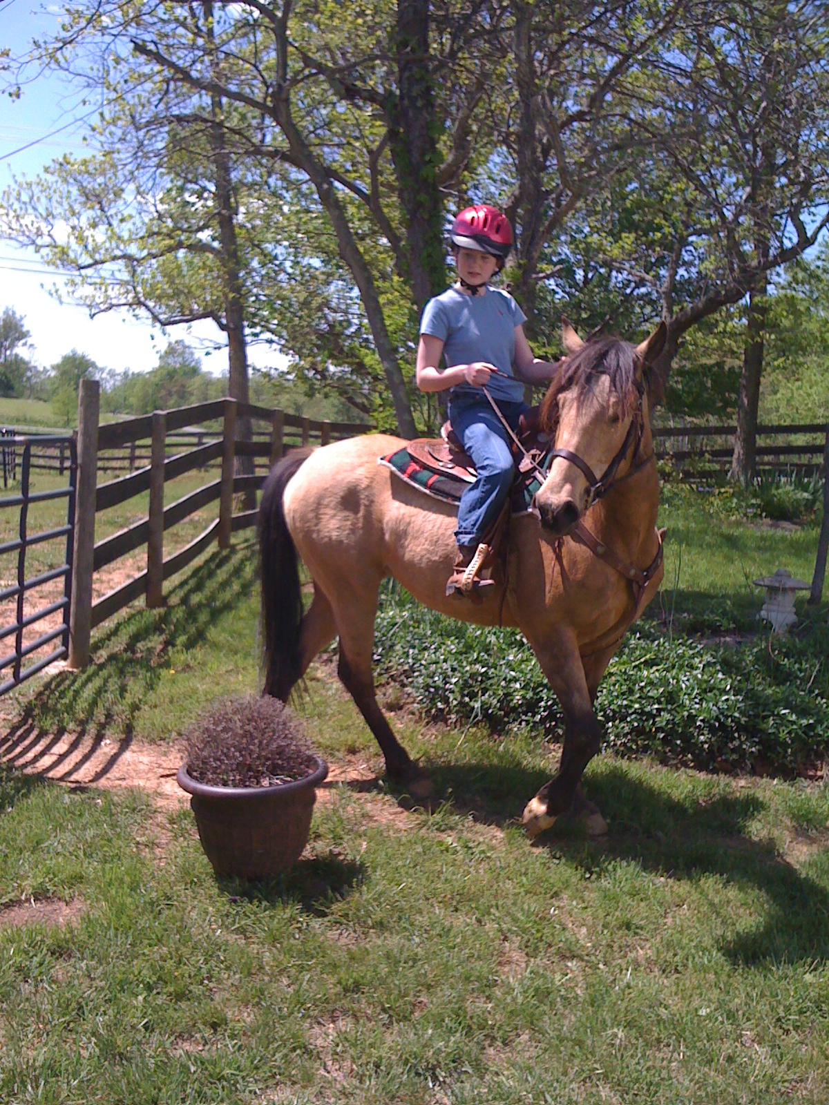 We ride and work all around the farm, not just the round pen. Olivia is working around a flower pot!
