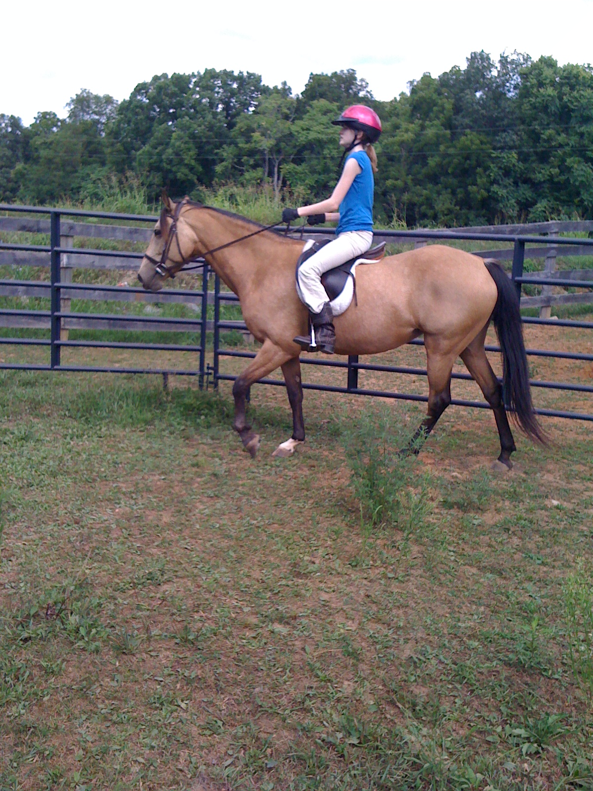 I usually practice posting in a round arena, so High Hope can trot in a circle. I will usually start out walking, then ask High Hope to trot when I’m ready. She might stop, stumble, ro shy, or even refuse to trto, so I have to work to make her trot all the way around the ring. Rising out of the saddle is not hard, just doing it at the right moment. I’ve found that it is a little easier to post when High Hope trots quickly, because the movement kind of throws me out of the saddle. I will often change directions, and take High Hope around the circle clockwise or counterclockwise. High Hope likes to trot, and is pretty agreeable during these lessons.