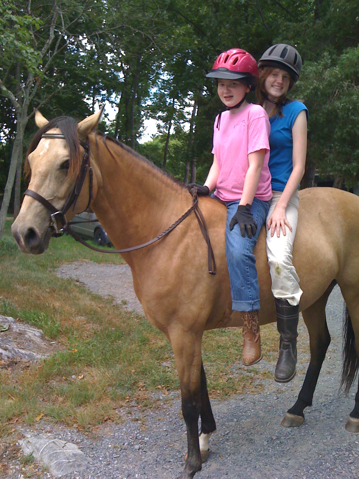 Our students always do some bareback riding as well. It is a great way to feel the movements of the horse. Here they are riding double. Look carefully at Anna Kate. See her big smile? It is more comfortable in the back. If it is any help, Olivia, when I was your age I had to ALWAYS ride in the front too!