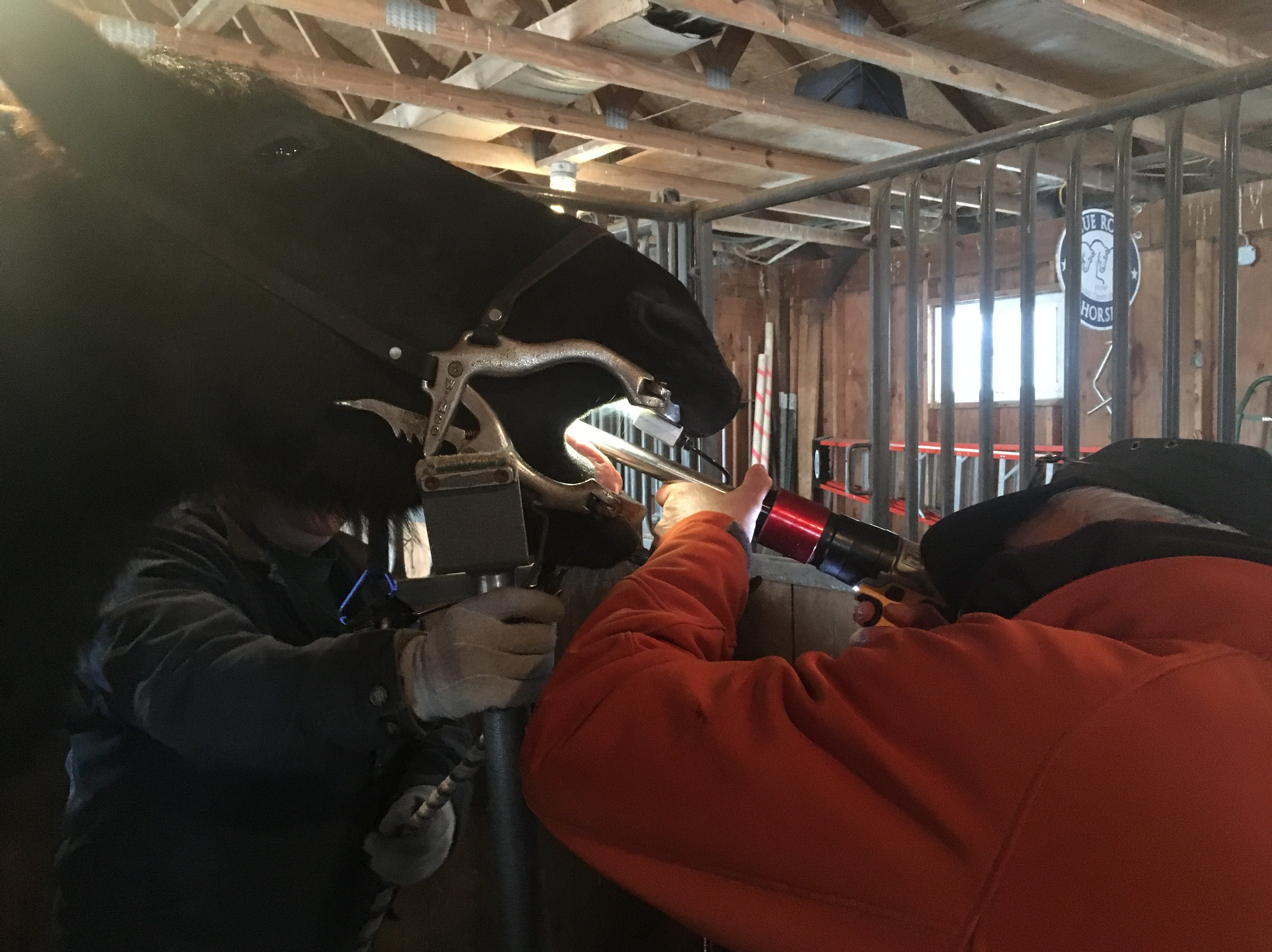 Horses are sedated before the procedure is started. In the above photo Duke is obviously not feeling too much pain. A bright light is attached to the mouthpiece that holds his jaw open. In the below photo, it has been circled in a green marker.