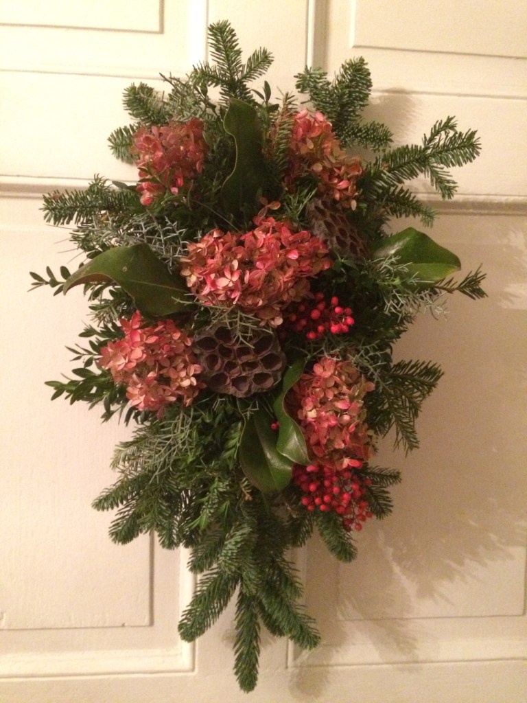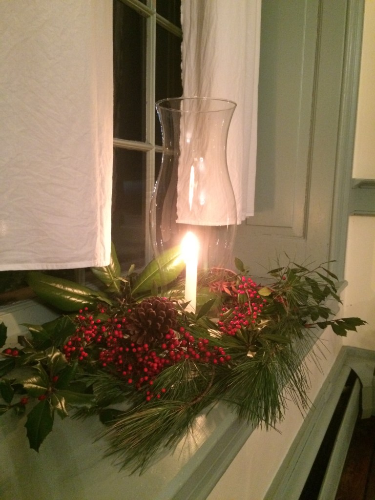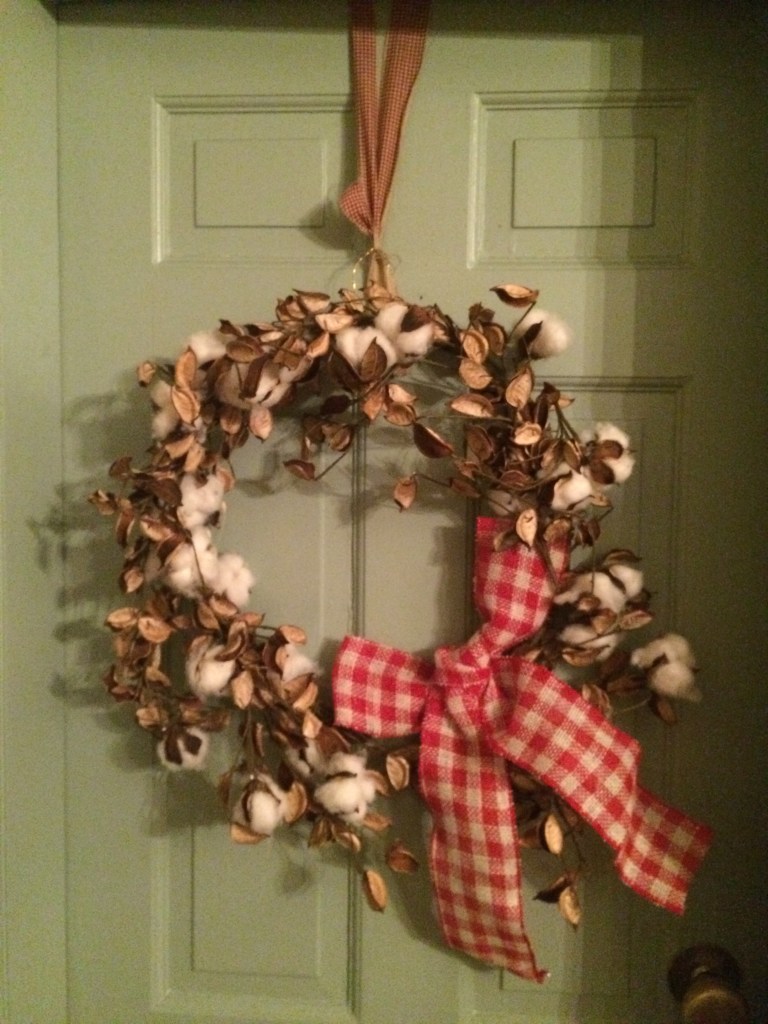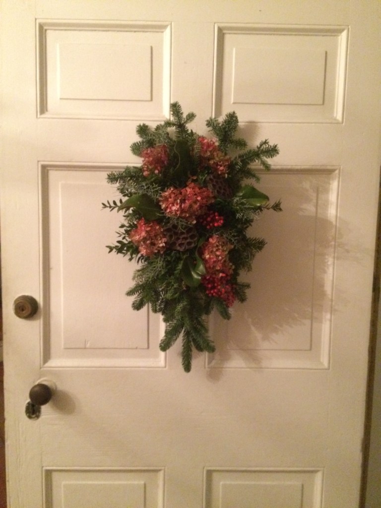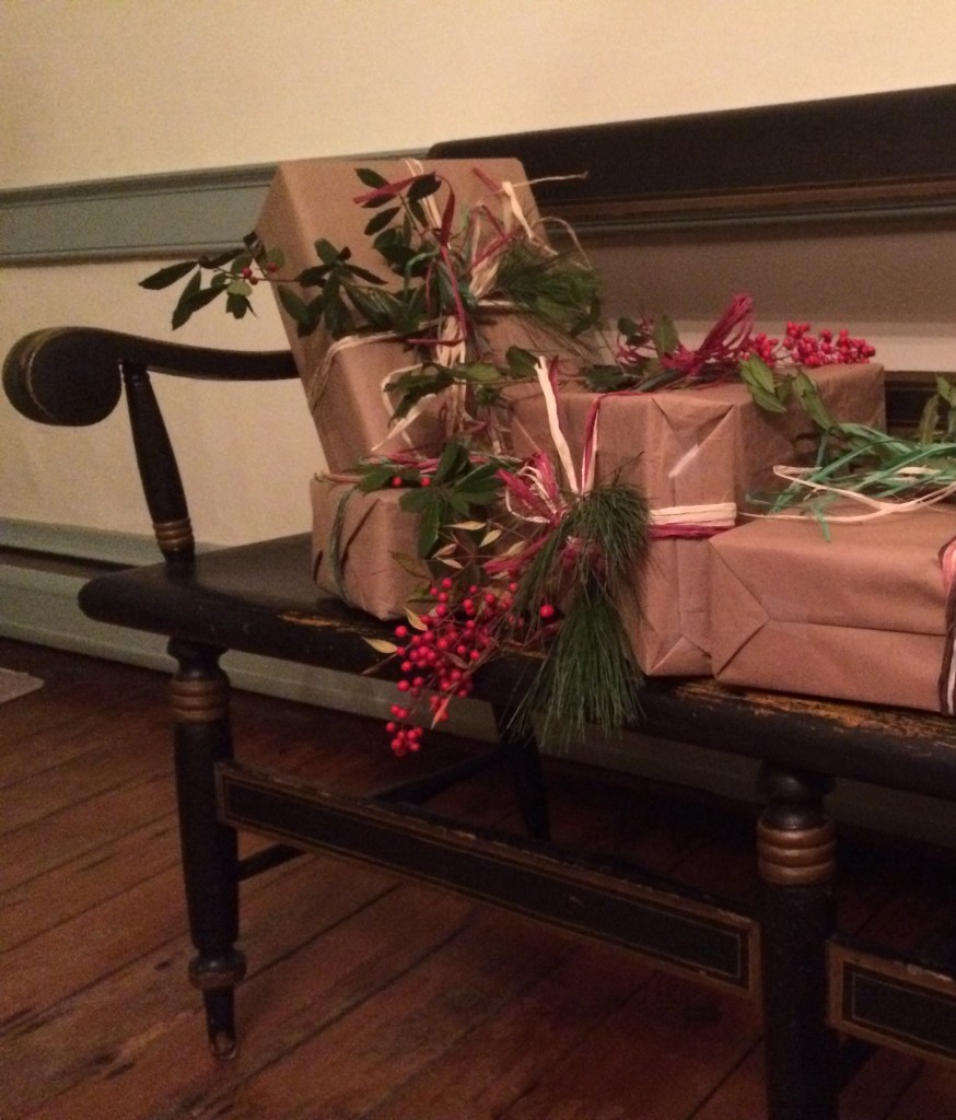 Simply beautiful Detail of door entry. Those gorgeous dried hydrangeas were spray painted with red paint. Aren’t they lovely?Our cheerful greeter in the Reception Room. This cotton wreath with the happy, red-checkered bow is charming.Our guests were thrilled that we had real candles!Beautifully wrapped gifts full of anticipation.