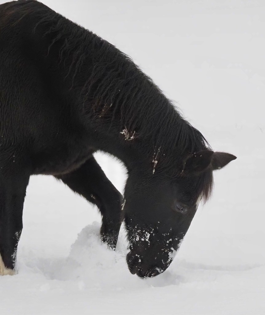 This winter has seen very little snowfall. A pretty snow fell around mid-December, and that is it. Most folks do not miss it much, nor the work that comes with it. But I enjoy being out in it walking the dog (and cats, they come too), feeding the horses and watching their foggy breath float all around their heads and muzzles. Snow quietly falling on their shaggy winter coats. Do you know a horses’ coat can grow 1/4 on cold winter nights? Cool huh?
