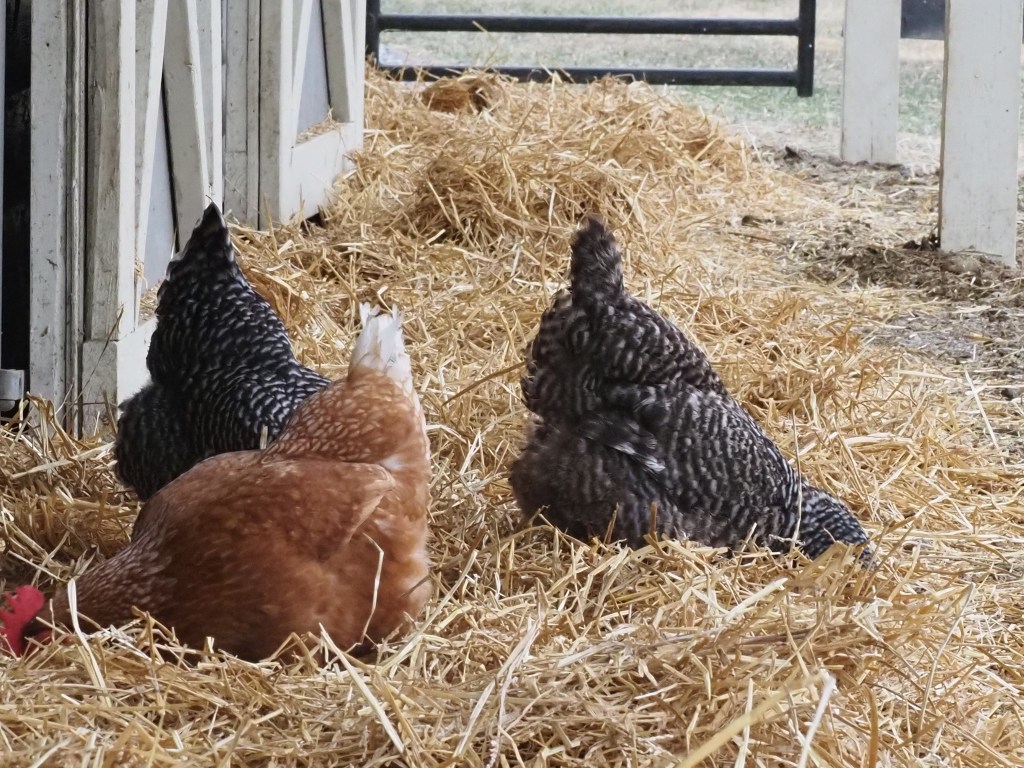 In preparation, this past Sunday afternoon found my husband in the warm garage getting blades set up on the tractor, checking fluids, and filling up with fuel. I, on the other hand, was out tending to the animals and barn. Spreading fresh, warm straw in stalls, and under the roof for the horses, checking salt, filling water troughs, filling the chicken feed dispenser and fresh water. How chickens enjoy scratching around fresh straw!