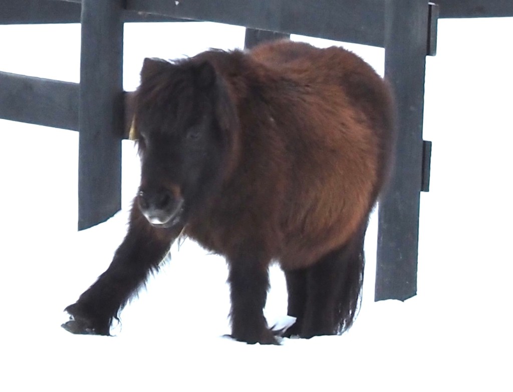There are about five inches of snow on the ground, with a nice, hard layer of ice firmly placed all over the top like a crusty bagel. The strong winds demand the ice to stay put, which makes it all the more easy to stay put in the house as well. No chance of any melt today either. There is some clearing we need to do with the tractor blade out at the barn. The thick ice and frozen ground puts a strain on the horses, most especially the minis. They stayed in and around the barn all day yesterday. Duke ventured out a bit this morning, but not for long. Our mini, Snowbell, thought she would join him, but smartly changed her mind.