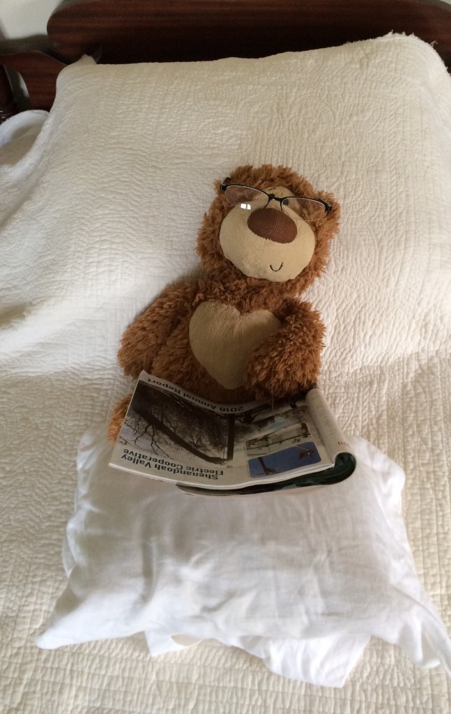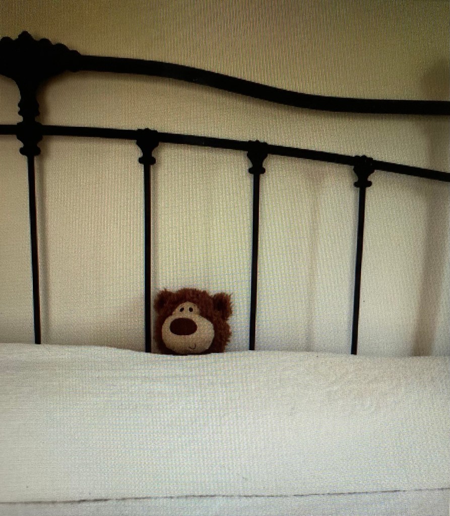 That little bear has been on our bed every since. My husband has a grand sense of humor, and over the years I have come into the room and found Bear Happiness in the funniest of poses all over our bed. I would like to share some of them with you. May they add a smile to your day. There is a Latin saying at the old home where I work: Disce Ferenda Pati. Translated: Bear Patiently what must be borne. It was a right long haul back to good health, but this little Bear Happiness sure helped the journey and still brings joy to this day.