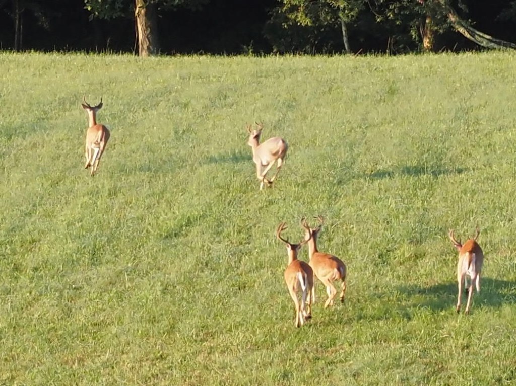 The early morning sun shining over the field is an inviting draw to the wildlife from the still damp, and shaded woods to come out, browse and greet the morning.
