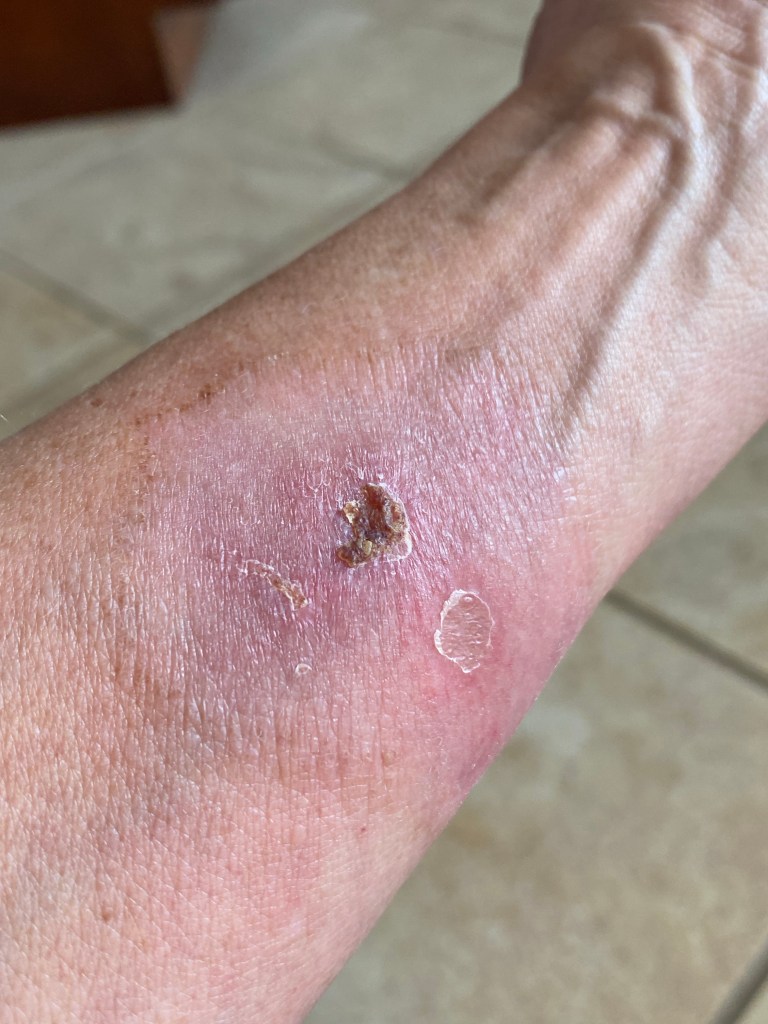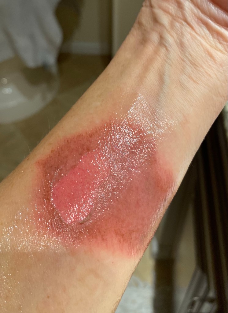 Although the photos make it look as if a blister came up on the burn, it did not. Long sleeved shirts irritated the tender new skin, and it peeled. This was the hardest part of the healing process, as it was quite tender. The sleeve needed to stay rolled up. Problems presented themselves when I had to go out in public. This is when I bandaged the wound to protect it from the sleeve and being out in public without being exposed. Sleeping was a bit of an issue as well. It seemed no matter where I placed my arm, the sheets would aggravate it. I did not want it covered at night as it needed air to help the healing process.