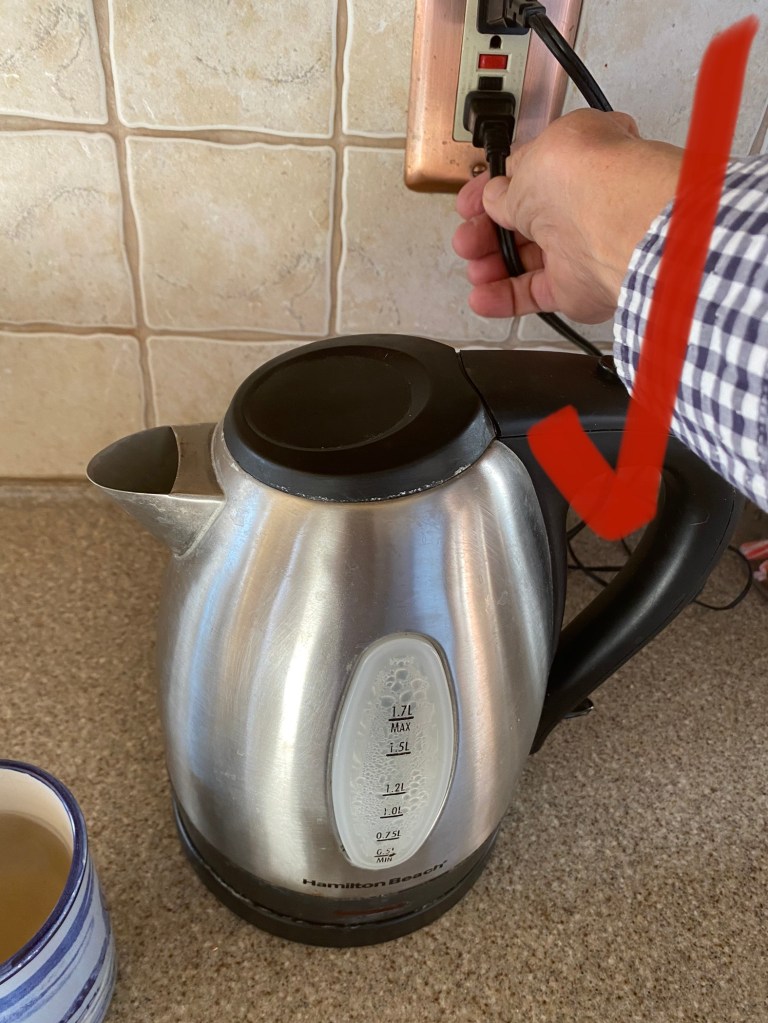 I reached for the electric plug from the wrong side. A careless move that caused a steam burn on my arm. Never reach across an electric boiling steam kettle on the spout side, always unplug from handle side.