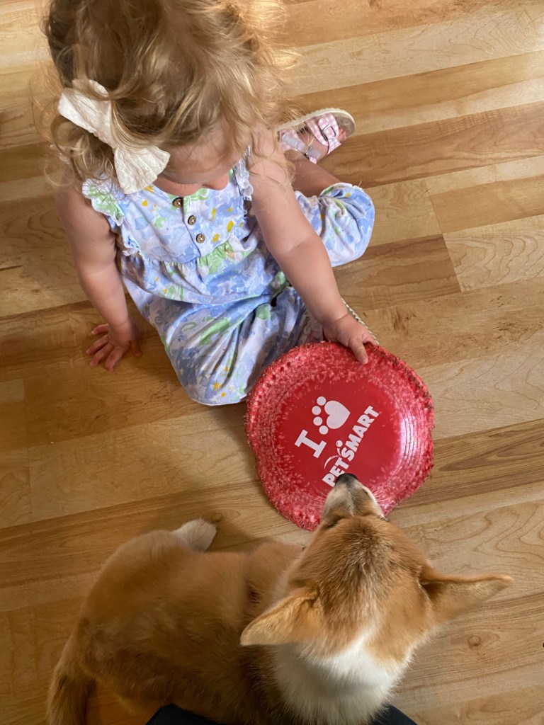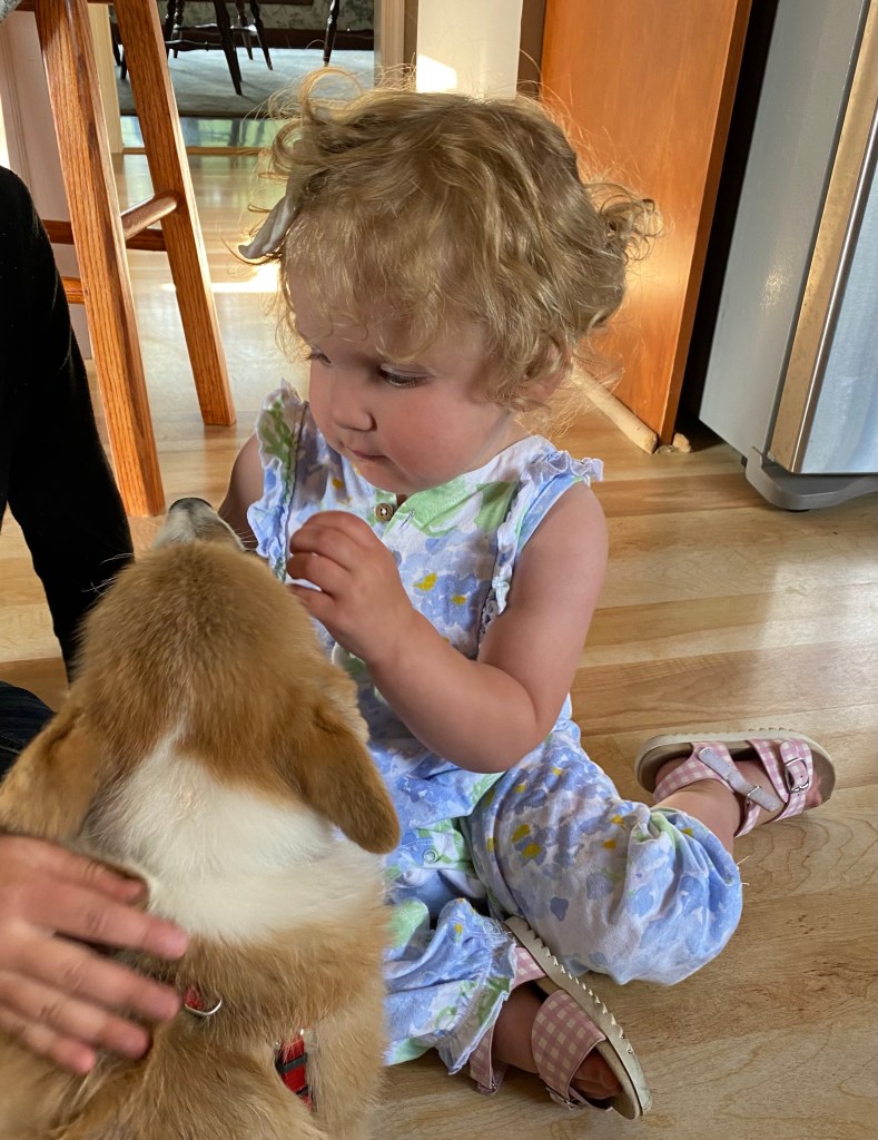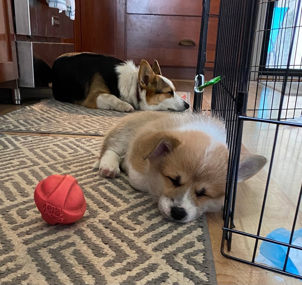 HoneyPie, our two-year-old Corgi is a big help with him also. She keeps him in line. If he gets too wound up with jumping around and nipping, she is quick to tell him to settle down.