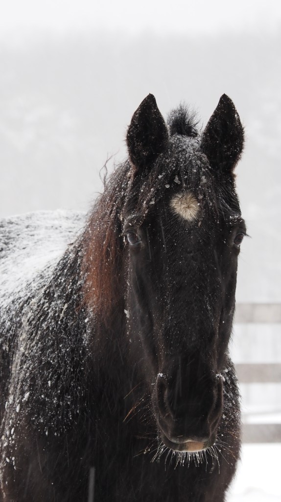 The pretty white shining star on his forehead is also a beacon of light in our daily game of hide n’ seek. Last but surly not least, is snow. He is always a dead give away in snow!