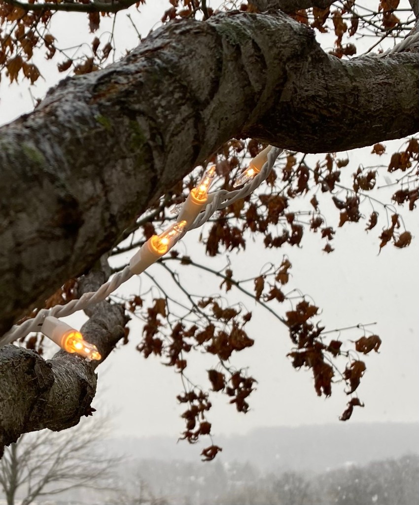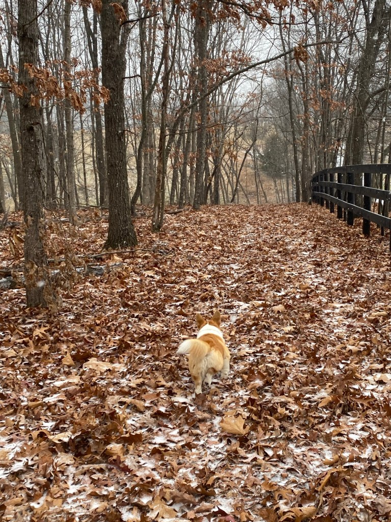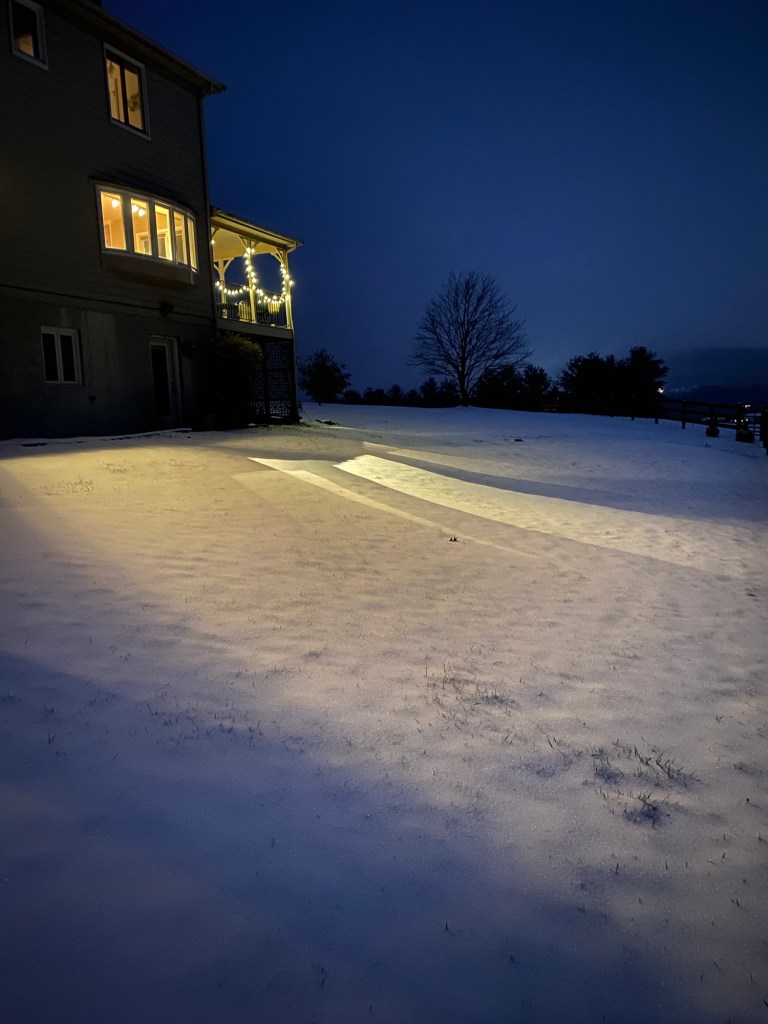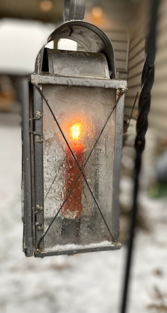 An ‘ole grey day, taking through window. Duke and High Hope seem oblivious.Grey or snowy, it is still cozy. Can you see Raggedy and Snowbell? They are in front.Walking up the hill in our field—to nowhere?Outside lights on grey days are warm.Even the birds are quiet in the woods. The crunching of footsteps and……the dogs running make the only sounds.A fire makes every wintery day better.By the fire is the best place to be on a day like today.Evening lights on snow are a delight.My favorite place is downright inviting at twilight.The soft glow from the tin lantern warms the snowy sidewalk.