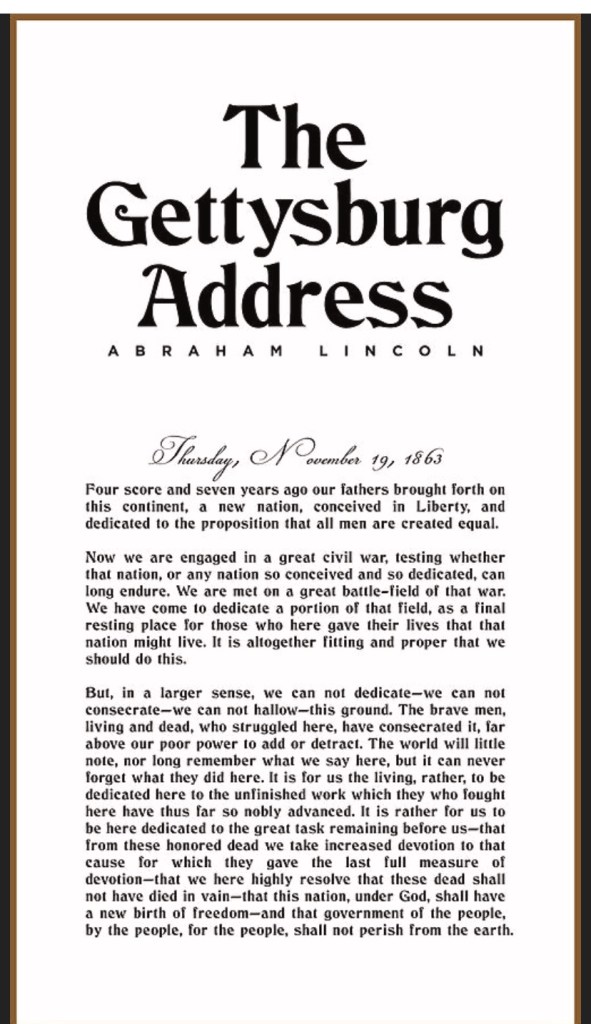 It seems fitting the Gettysburg Address will comprise my thoughts for today. I pray all who read this will be reminded of the difficult task our early leaders toiled tirelessly for for this great country they passed to us. May we each do our part in keeping it.