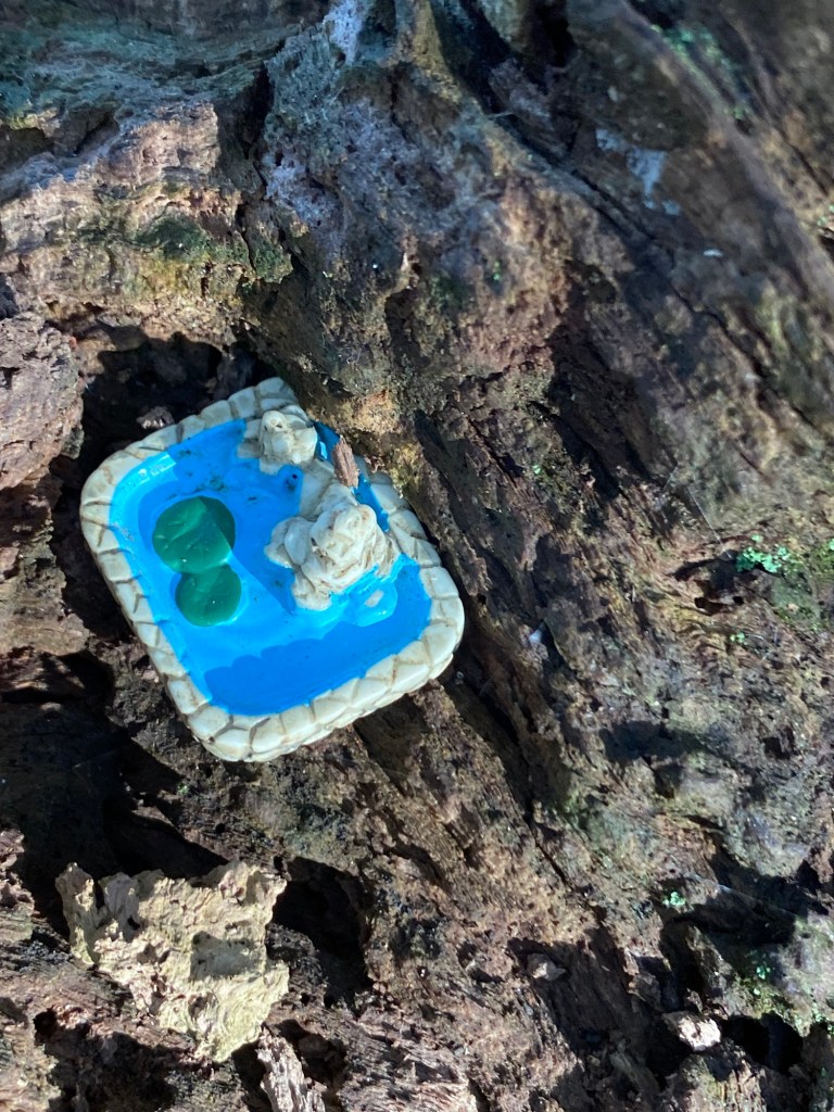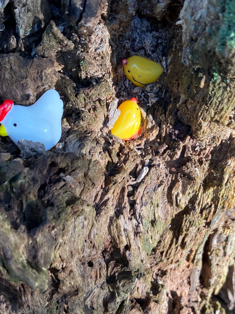 Several days later, to my great surprise, a bright, tiny color caught my attention on the old stump. It had been transformed into a petite display of miniatures! Tiny glass mushrooms, glass white chicken and her two bright yellow chicks and a tiny pool. The old, decaying stump has turned into a mysterious, happy setting of fun and imagination.