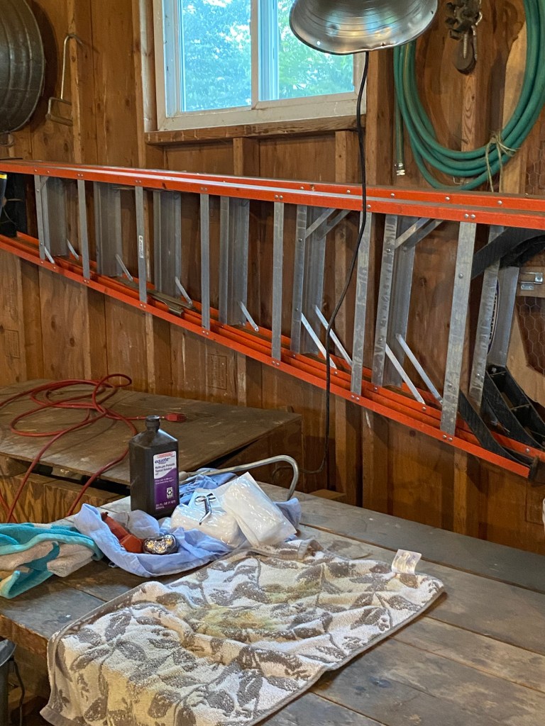 Quietly carrying her to the barn while I frantically gathered supplies, they waited patiently on the ‘surgical table‘.
