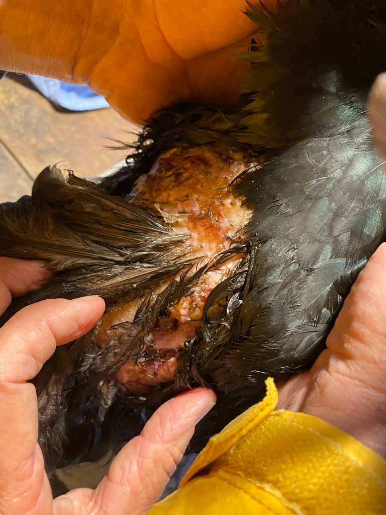 She was torn and bitten on both her sides, feathers were everywhere. However, her wings seemed fine, as did her legs.
