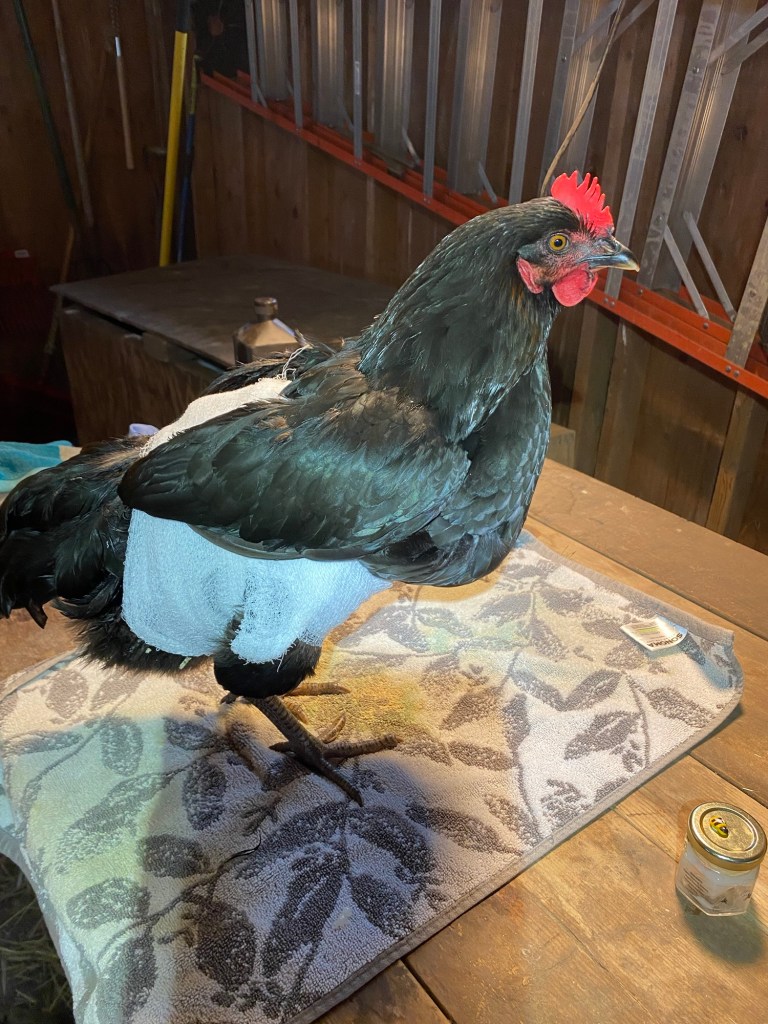 Finally with the dogs closed in the house and everyone gone, attention turned to our poor, little, beat up chicken.