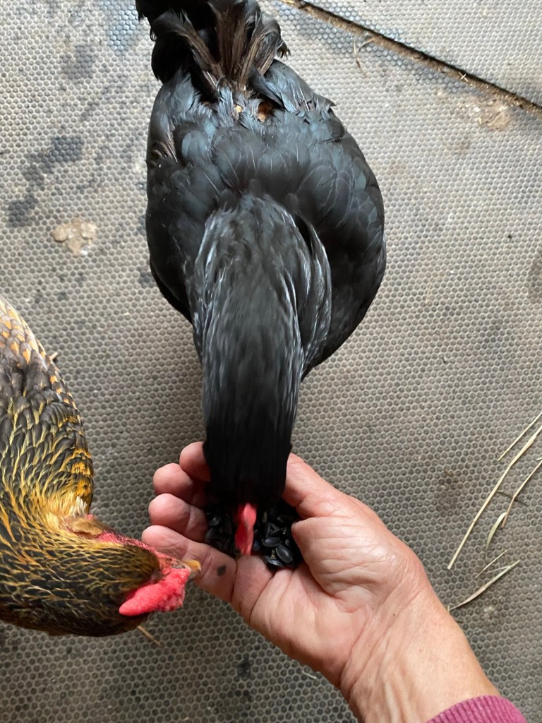 We have only two chickens (a fox got the rest), and I watched the other one carefully. Doris still has bare spots on her little body, though feathers are growing back. All seemed well, and indeed all is well.