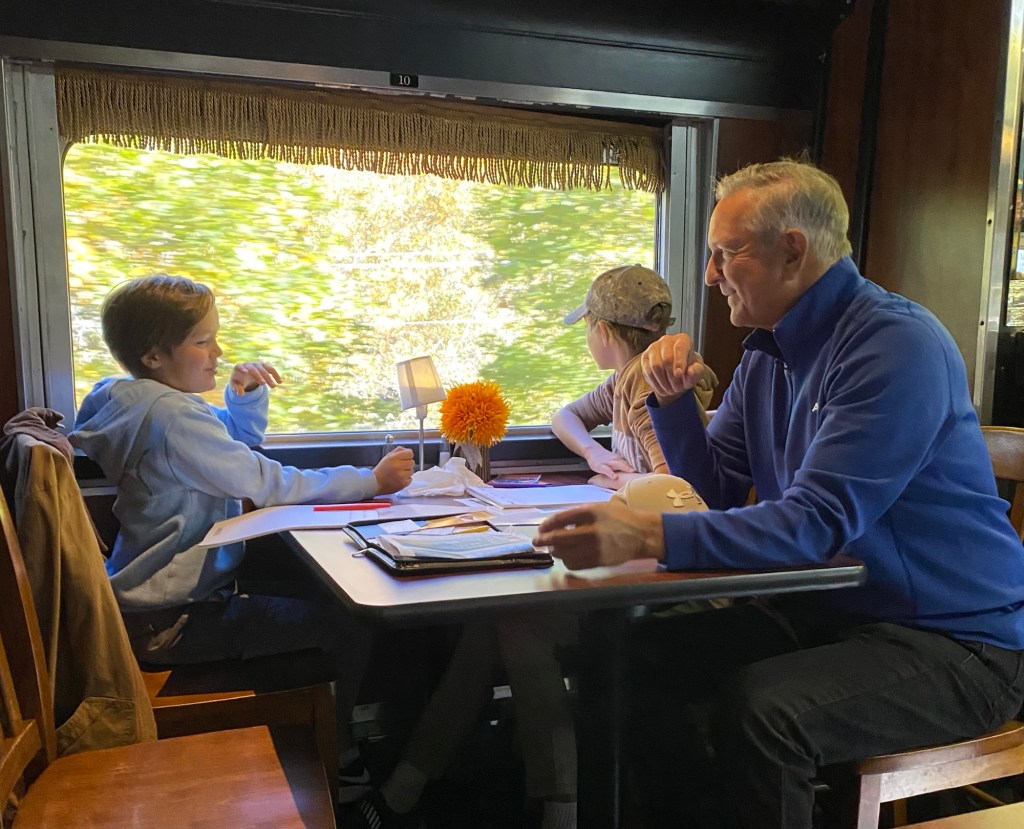 An extra-special treat was offered for two passengers coming back or going to Frostburg willing to pay the passage. Two guests could ride in the engine with Diesel Dave, the engineer. We quickly booked the ride for two of our grandsons (the other g/son was too young) for the trip back down the mountain.