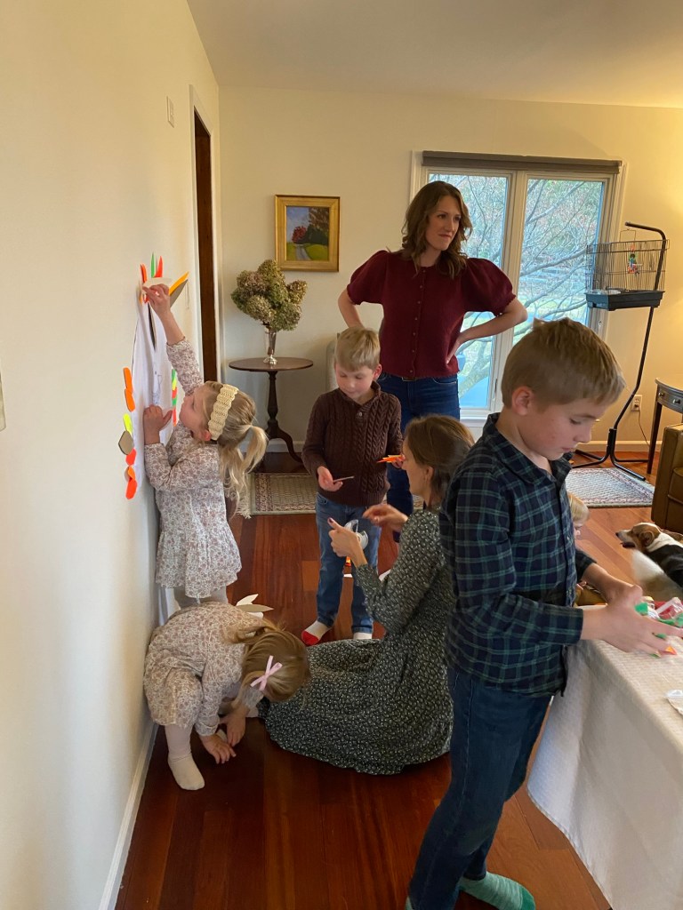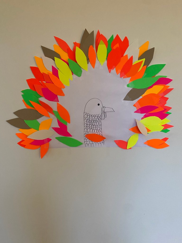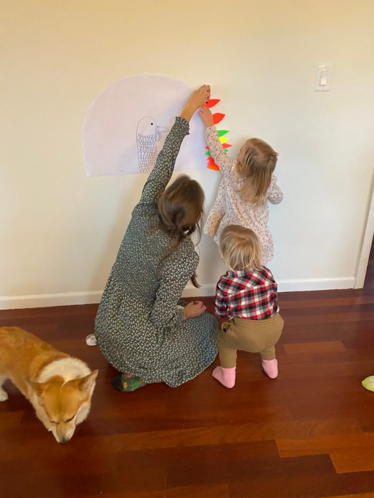 We cut out ‘feathers’ from colored paper, put them all about the house. The children ‘found’ them and taped them to the drawn Turkey we taped on the wall. It was fun, but did not last very long.